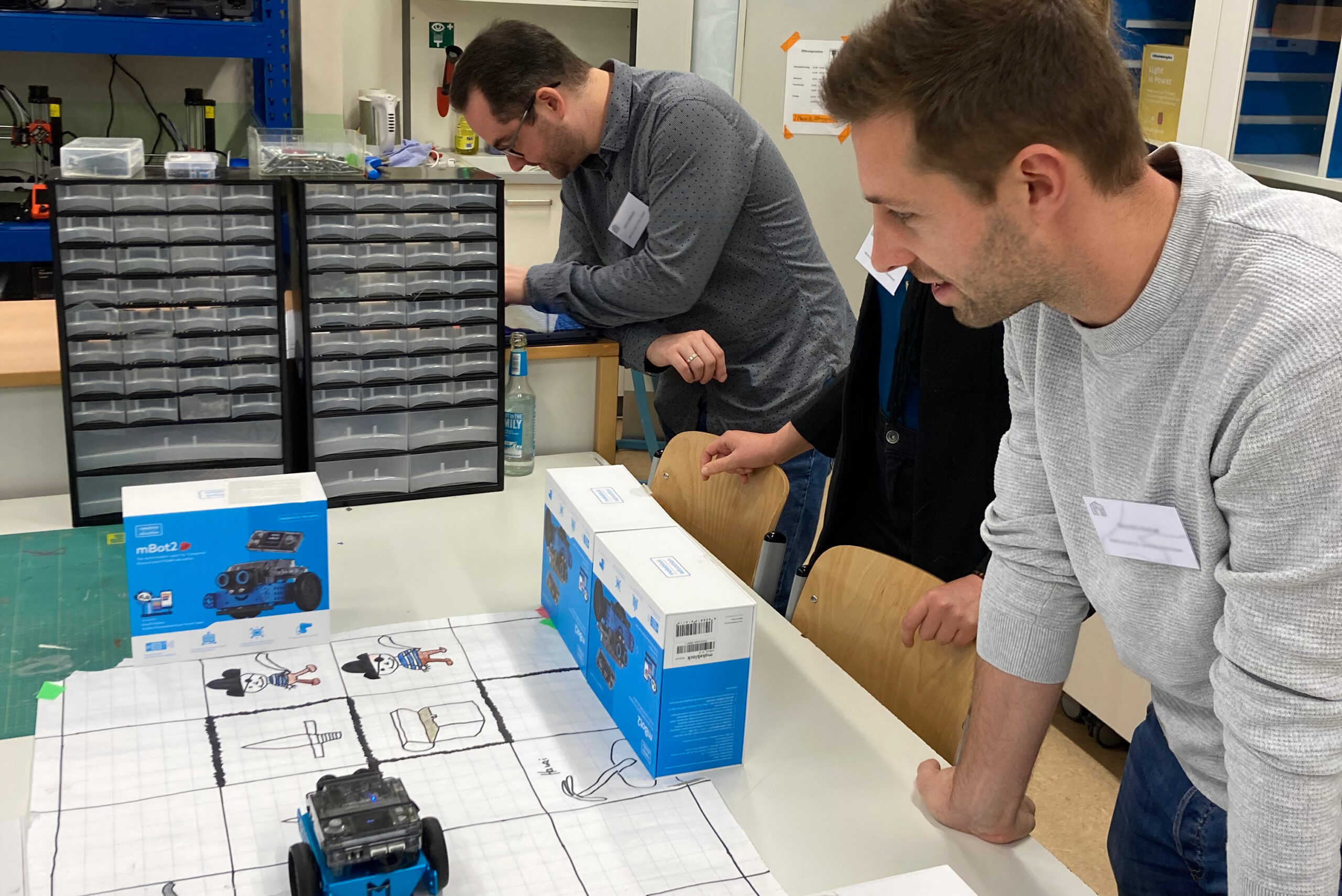Wie diese Eigenverantwortung in der Praxis funktioniert, erlebten die Teilnehmenden des Community-Treffens vor Ort. Bei einer Schnitzeljagd durch den Makingspace lösten die Lehrkräfte verschiedene Aufgaben, wie 3D-Druck anwenden, T-Shirts bedrucken und M-Bots programmieren. Schüler*innen aus dem Makerclub unterstützten die Lehrkräfte dabei als Lernbegleitung und übernahmen gleichzeitig die Rolle der Schiedsrichter*innen bei der Punktevergabe. Insbesondere das große Selbstbewusstsein, mit dem die Schüler*innen „ihren“ Stübi präsentierten, sorgte für nachhaltige Begeisterung bei den Make-Your-School-Lehrkräften.